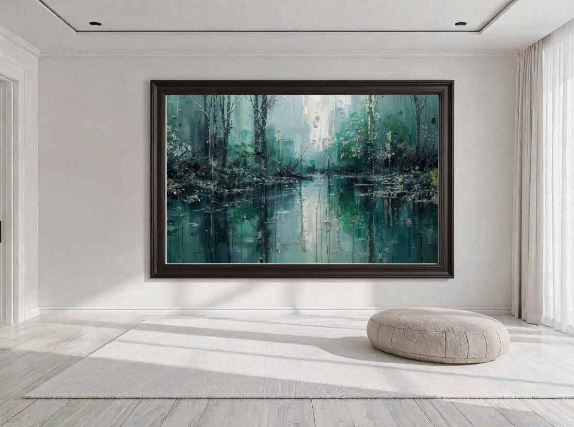 Das Werk basiert auf der künstlerischen Interpretation einer nebligen Seenlandschaft in den frühen Morgenstunden. In der Komposition bilden fließende, organische Schichten und diffuse Horizonte ein harmonisches Gefüge, das eine sanfte, aber stetige Tiefenwirkung erzeugt. Bei der farblichen Gestaltung wurde eine kühle, edle Palette aus tiefem Smaragdgrün, sanftem Mint und kühlem Silber gewählt, um die Frische von Tau und mineralischen Gesteinsstrukturen zu imitieren. Durch das gezielte Setzen von silbernen Akzenten und Lichtkanten entsteht der Eindruck von metallischem Glanz, der wie kühles Mondlicht oder frostige Reflexionen auf der Landschaft liegt. Das Bild konserviert die mystische Stille unberührter Natur als zeitloses, modernes Statement.
