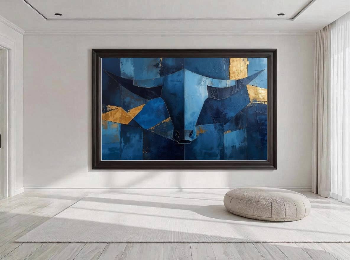 Abstrakter Stierkopf in Blau & Gold – Expressives Wandbild für moderne Räume